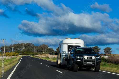 ute pulling horse float trailer on rural road through farmland countryside