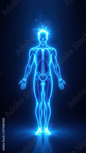 Vagus Nerve Stimulation, Illustration of Human Body with Superimposed Blue Brain Activity and Nerve Pathways