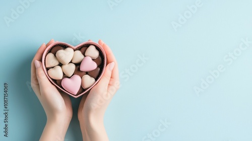 valentine chocolates memories concept, A pair of hands holding a heart-shaped box filled with assorted heart-shaped chocolates against a soft blue background.