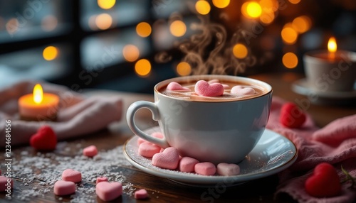 Valentine Hot Chocolate with Pink Heart-Shaped Marshmallows and Sugar Sprinkles