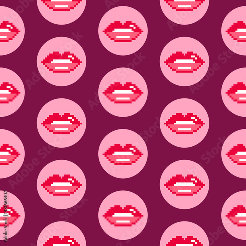 Valentine's retro 8-bit pixel lips circles burgundy pattern