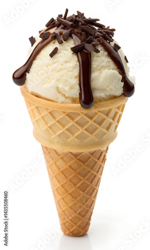 Vanilla ice cream cone with chocolate syrup and chocolate shavings top on white background