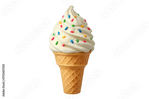 Vanilla soft serve swirling in waffle cone, topped with vibrant rainbow sprinkles, floating against transparent backdrop