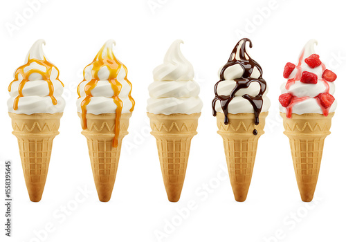 Variety of delicious soft serve ice cream cones with caramel chocolate and strawberry toppings Isolated on transparent background