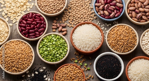 Variety of dried legumes and grains in bowls on a wooden surface for healthy eating diet 96