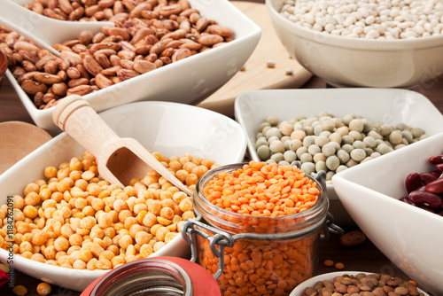 variety of legumes in bowls and glasses
