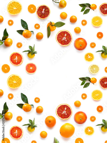 Various fruits (orange, tangerine) isolated on white background, top view, creative flat layout.