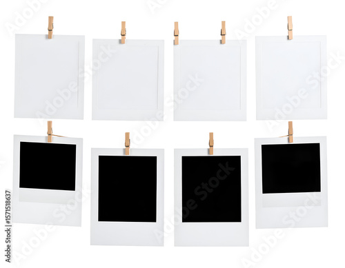 Various blank photo frames and instant prints are suspended by classic wooden clothespins.