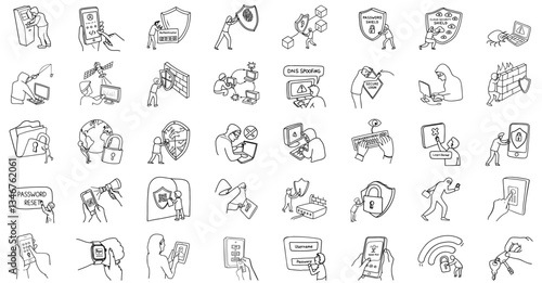 Various cybersecurity concepts illustrated in line art, including password protection, data encryption, and network security