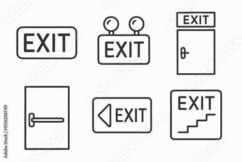Various exit signs including doors and arrows