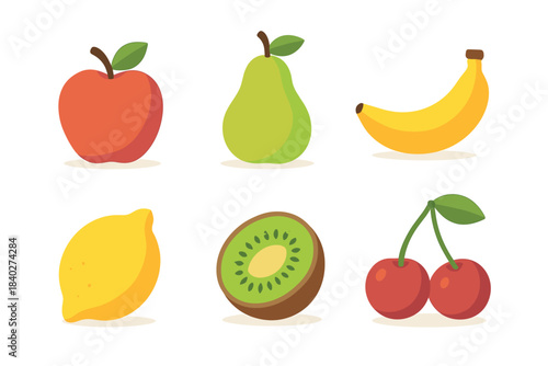 Various fresh fruits in a flat design style collection featuring an apple, pear, banana, lemon, kiwi, and cherries, perfect for healthy eating concepts.