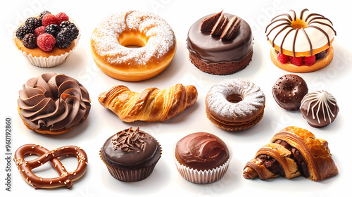 Various of sweets and desserts set and collection. chocolate cake, cupcakes, red velvet cake, apple pie, macarons, pretzel, donut, pastries, muffin, cookies, croissant. Bakery sweets isolated on white