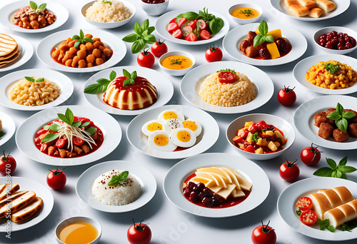 various plates food white background high resolution high details vibrant