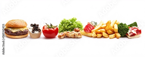 Various types of food forming a line from hamburger to pizza, representing a balanced diet