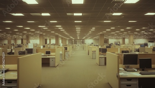 Vast Empty Office Space: A Silent Symphony of Beige Cubicles