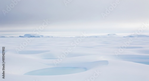 Vast expanse of frozen Arctic landscape with ice floes and a distant iceberg under a pale sky.