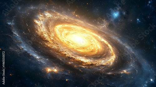 Vast spiral galaxy with luminous core and cosmic dust.