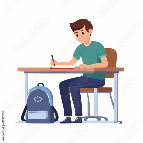 Vector animation of a student writing with a mechanical pencil at a modern school desk, with a backpack beside the chair