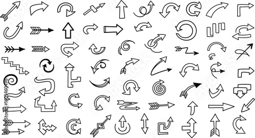 Vector art of a large assortment of handdrawn arrow illustrations isolated on white background, showcasing diverse shapes and directions for creative projects