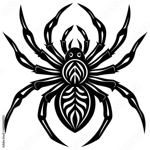 Vector art of a stylized black spider with intricate patterns isolated on white background