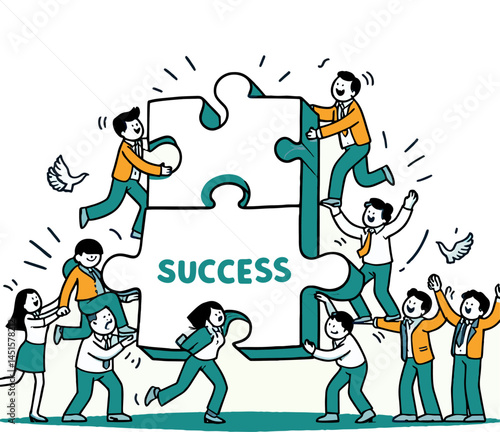 Vector cartoon stick figure drawing of a group of stick figures working together to build a large puzzle piece labeled 'Success'. One figure is lifting, another is guiding, and one is cheering.
