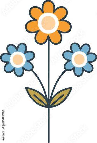 Vector Cute Cartoon Flowers with Orange and Blue Petals, White Centers, and Green Stems in Pastel Colors
