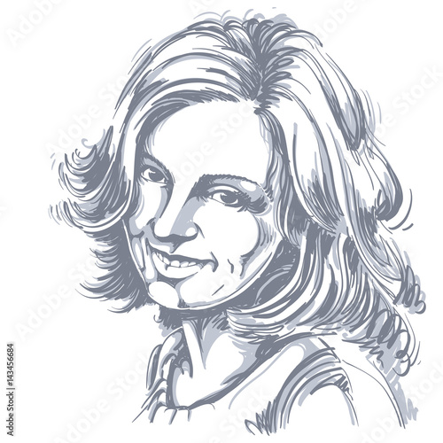 Vector drawing of smiling sincere woman with stylish haircut. Black and white portrait of attractive happy satisfied lady. Model posing.