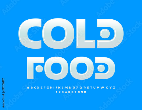 Vector Emblem Cold Food. White Glossy Font. Modern Alphabet Letters and Numbers set