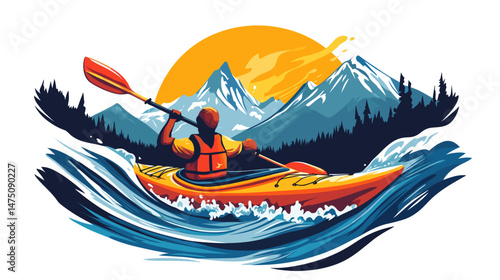 Vector Illustration for t-shirt of A kaykaker on wild river in mountain landscape, , isolated on white background, colorful illustrations, simple shapes, flat color. Outdoor adventure in wilderness. A