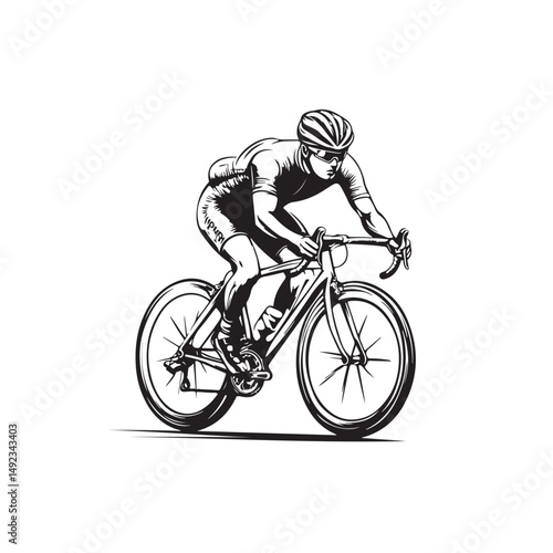 Vector illustration of a man racing a bicycle in a dynamic and energetic pose, isolated on white background.