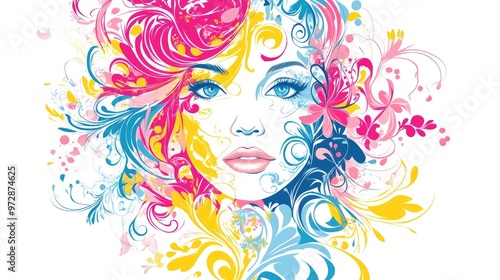 Vector illustration of a stylized woman's face with intricate swirling floral patterns in pink, blue, and yellow on a clean white background