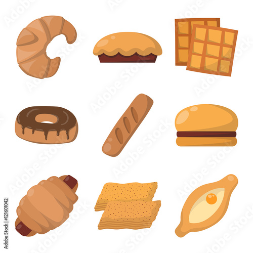 Vector illustration of bakery product food collection. Breakfast wheat meal chocolate dessert bakery products. Fresh grain product bun roll bakery products grocery health diet snack gourmet cereal.
