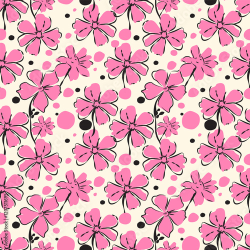 Vector illustration of bright pink seamless pattern flower with ink style circle dots on a cream colored background. Have fun and lively For design, printed fabric, wallpaper, card, packaging, fashion