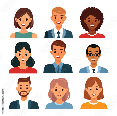 Vector illustration of diverse business and casual people avatars. Smiling men and women portraits in flat cartoon style, suitable for profiles, team presentations, and apps.
