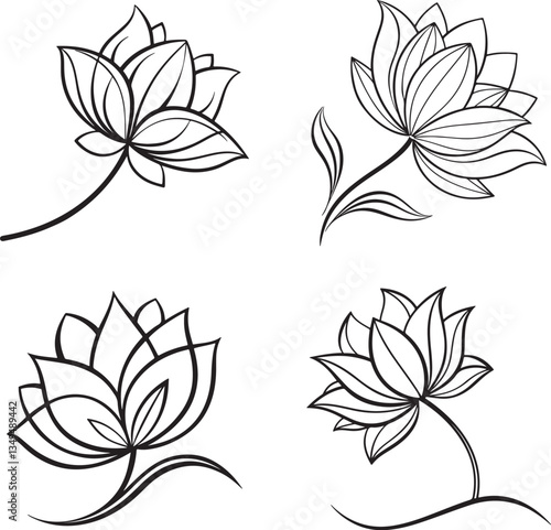 Vector illustration of four black and white lotus flowers accompanied by leaves, forming a logo icon set