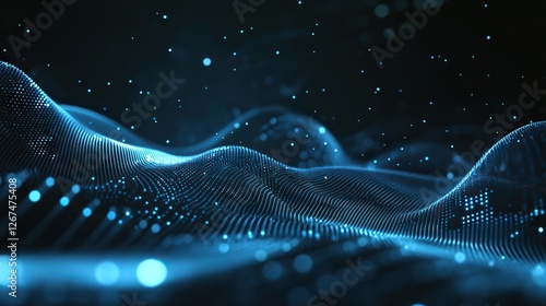 Vector Illustration of Hi-Tech Concept with Blue Dots and Lines on Black Background, Particle Wave Motion, Digital Technology Banner, Sound Equalizer, and Music Waves. 8K Resolution
