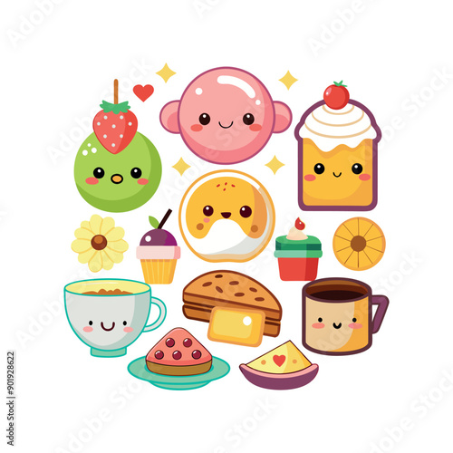 Vector Kawaii Breakfast collection Clipart illustration On a White Background