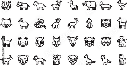 Vector line art set of wild and domestic animals including elephant, horse, bear, kangaroo, dolphin, squirrel, rabbit. EPS-ready for nature, education, and wildlife themes.