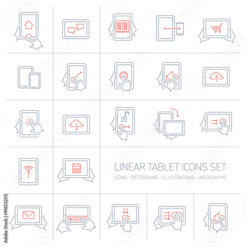 Vector linear tablet icons set with hand gestures and pictograms