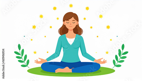 vector of a person meditating in lotus position. Peaceful face, floating icons of plants or sparkles around