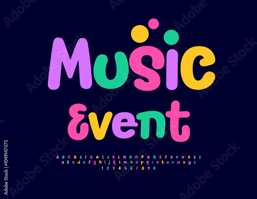 Vector playful badge Music Event. Funny Colorful Font. Bright set of Alphabet Letters and Numbers.