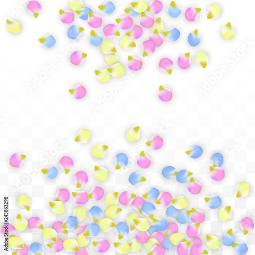 Vector Realistic Colorful Petals Falling on Transparent Background. Spring Romantic Flowers Illustration. Flying Petals. Sakura Spa Design. Blossom Confetti. Design Elements for Wedding Decoration.