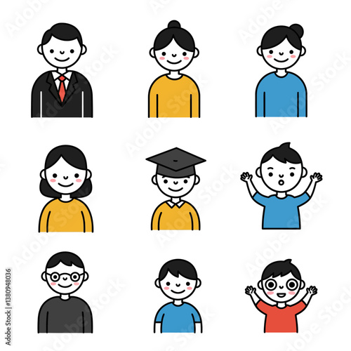 Vector set of business people icons with diverse avatars including men and women in suits, symbols for office and team
