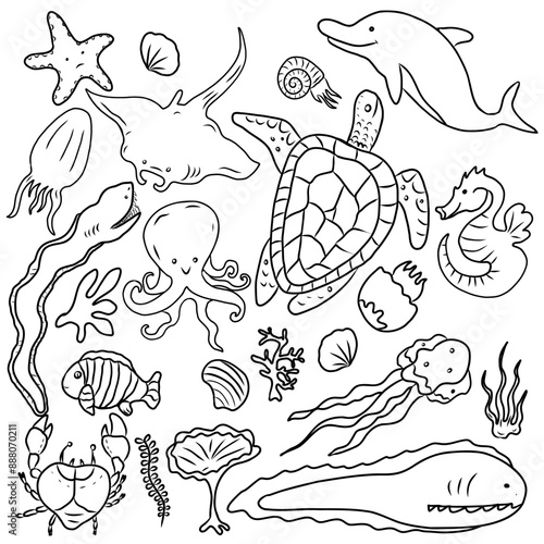 Vector set of underwater life. Hand drawn sketches of sea turtle, dolfin, jelly fish, shells, octopus and other oceans animals.