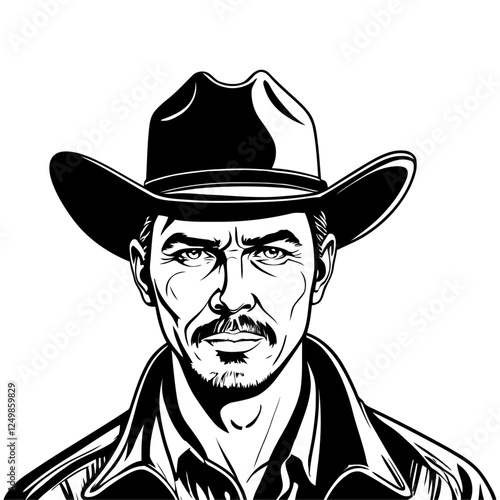 Vector silhouette of a cowboy portrait, isolated in white. Ideal for western-themed designs, logos, and digital artwork.