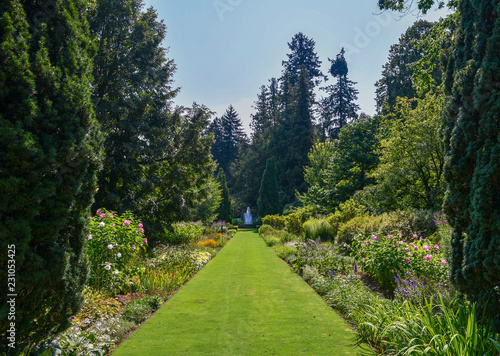 Veduta di un giardino in stile classico italiano con sentiero a prato verde, aiuole fiorite, alberi e fontana, Villa Taranto, Lago Maggiore, Piemonte, Italia