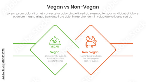 vegan vs non vegan or vegetarian comparison concept for infographic template banner with diamond outline shape and rectangle with two point list information