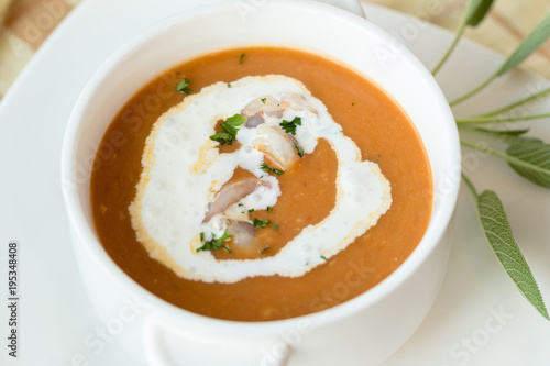 Vegetable cream soup with shrimps and croutons in white bowl close up