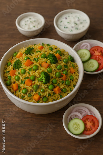Vegetable Pulao with Raita and Salad on Rustic Wooden Table – Indian Lunch Delight