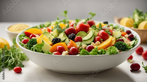 Vegetables and fruits in bowl. Salad bar for healthy meal. Vegetarian dish. Healthy food on white background
